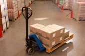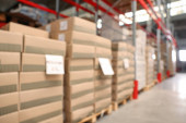 Magazyn z stosami pudełek na paletach drewnianych. Sprzedaż hurtowa