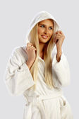 ładny blond dziewczynka w biały szlafrok uśmiechający się