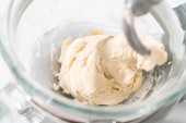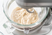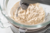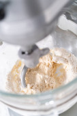 Składniki mieszające w dużej szklanej misce do mieszania ciasta z pizzą.