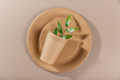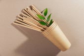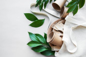 Catering i ulicy fast food kubki papierowe, słomki i zielone liście. Akcesoria do jedzenia i picia na świeżym powietrzu. Ekologia, koncepcja recyklingu.