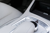 Widok wnętrza samochodu z salonu beżowy i czarny deska rozdzielcza