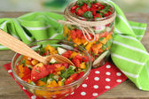 Sałatka jarzynowa w szklanym słoiku, w serwetkę, na tle drewniane