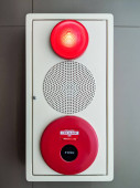 Przycisk alarmowy przeciwpożarowy do sterowania systemem bezpieczeństwa na tle ściany budynku w biurze, fabryce lub szkole