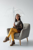 Azji model patrząc w aparat siedząc na krześle na szarym tle