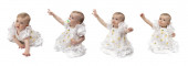 Dwuletnia dziewczyna w ciemnoniebieskiej sukience wspina się na dwuetapowe krzesło. Staje na pierwszym kroku i patrzy w kamerę. Blondynka z niebieskimi oczami. Na białym tle.