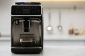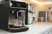 Nowoczesny elektryczny ekspres do kawy z filiżanką kawy na białym marmurowym blatze w kuchni