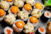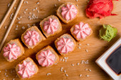 Zbliżenie pięknego japońskiego sushi z kapturem sosu, zdjęcie do menu