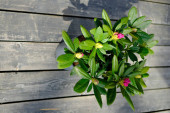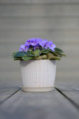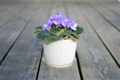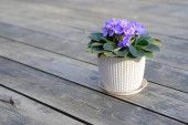 wiosna kwitnący fiolet w białym doniczkowym garnku na szarym drewnianym tle