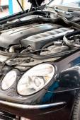 Maska samochodu jest otwarta, a silnik pokazany jest z bliska. Wybrane skupienie, rozmyte tło. Serwis samochodowy, naprawa, konserwacja, części zamienne.