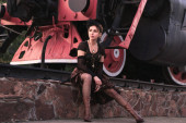 piękna kobieta sexy brunetka retro szałowy fryzurę i makijaż w szorty i koszulkę z pistoletu pca w jej ręce na pociąg. na zewnątrz. retro stonowanych