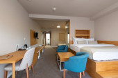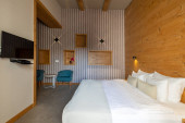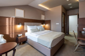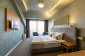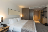 Zdjęcie "Wnętrze luksusowego hotelu podwójne łóżko sypialnia" może być wykorzystywane do celów osobistych i komercyjnych zgodnie z warunkami zakupionej licencji Royalty-free. Obraz jest dostępny do pobrania w jakości wysokiej rozdzielczości do 5760x3840.