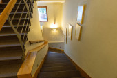 Wnętrze dywanowego korytarza hotelowego