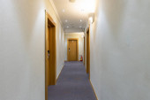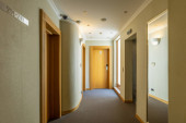 Wnętrze dywanowego korytarza hotelowego z brązowymi drewnianymi drzwiami