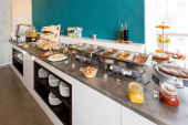 Śniadanie serwowane na stole w formie bufetu w restauracji hotelowej