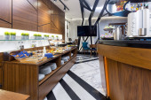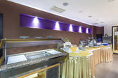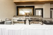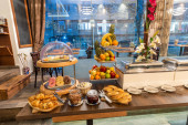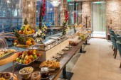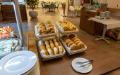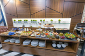 Śniadanie serwowane na stole w formie bufetu w restauracji hotelowej
