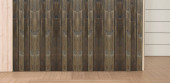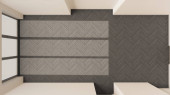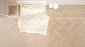 Pusty wystrój wnętrz, otwarta przestrzeń z dużymi panoramicznymi drewnianymi oknami łukowymi, klasyczny parkiet vintage drewniana podłoga, białe ściany, nowoczesny pomysł architektury, widok z góry, plan, powyżej
