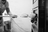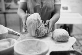 Piekarka posypuje mąką bochenki w kształcie chleba, w stylu rustykalnym, chlebem przed pieczeniem, chlebem pełnoziarnistym rustykalnym.