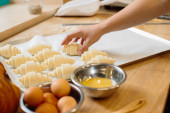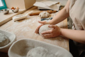Zdjęcie "Piekarka ugniata ciasto i przybiera drewnianą formę. Koncepcja piekarni." może być wykorzystywane do celów osobistych i komercyjnych zgodnie z warunkami zakupionej licencji Royalty-free. Obraz jest dostępny do pobrania w jakości wysokiej rozdzielczości do 5760x3840.