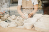 Piekarka ugniata ciasto i przybiera drewnianą formę. Koncepcja piekarni.