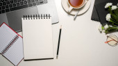 Close-p obraz wyposażenia biura z laptopem, notatnikiem, długopisem i okularami na drewnianym stole.