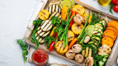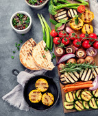 Grillowane warzywa na jasnym tle. Domowej roboty koncepcja jedzenia. Widok z góry, płaski, przestrzeń do kopiowania
