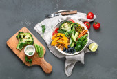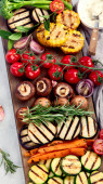 Zdjęcie "Grillowane warzywa na jasnym tle. Domowej roboty koncepcja jedzenia. Widok z góry, płaski, przestrzeń do kopiowania" może być wykorzystywane do celów osobistych i komercyjnych zgodnie z warunkami zakupionej licencji Royalty-free. Obraz jest dostępny do pobrania w jakości wysokiej rozdzielczości do 5760x3840.