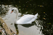 Łabędź na stawie. Pływający łabędź. Łabędź w parku. Ptak pływający