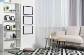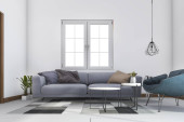 Stylowe wnętrze salonu z białą sofą, fotel i mały stolik kawowy