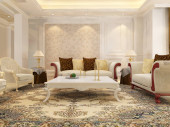 Ilustracja wnętrza pokoju dziennego z sofami i żyrandolami