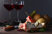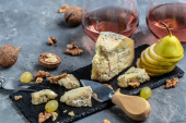 Romantyczna kolacja z winem i serowa płyta z owocami. Winogrona Gruszka Orzechy nerkowca ser z pleśni Gorgonzola. Szklankę wina z serem. Napoje.