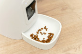 smart cat feeder szkocki kot czeka na jedzenie. karmnik dla zwierząt.
