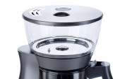 Burr szlifierka do kawy w plastikowej obudowie z wkładkami stalowymi, obiekt do mielenia ziaren kawy do produkcji espresso, przedni widok urządzenia gospodarstwa domowego izolowany na białym, nikt.