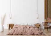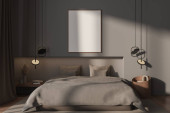 Zdjęcie "Dwie puste pionowe ramki na czarnej ścianie w nowoczesnej sypialni. Makijaż wnętrza w nowoczesnym stylu. Wolne miejsce na zdjęcie, plakat. Łóżko, parkiet, lampy, wazon, fotel rattanowy. Renderowanie 3D." może być wykorzystywane do celów osobistych i komercyjnych zgodnie z warunkami zakupionej licencji Royalty-free. Obraz jest dostępny do pobrania w jakości wysokiej rozdzielczości do 5760x3840.