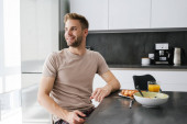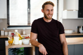 Uśmiechnięty, atrakcyjny młodzieniec stojący przy kuchennej ladzie w domu