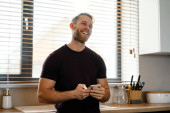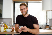 Zdjęcie "Uśmiechnięty, atrakcyjny młodzieniec stojący przy kuchennej ladzie w domu" może być wykorzystywane do celów osobistych i komercyjnych zgodnie z warunkami zakupionej licencji Royalty-free. Obraz jest dostępny do pobrania w jakości wysokiej rozdzielczości do 5760x3840.