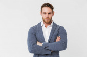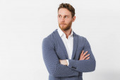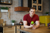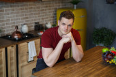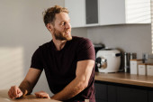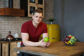 Uśmiechnięty, atrakcyjny młodzieniec stojący przy kuchennej ladzie w domu