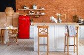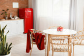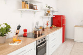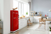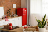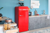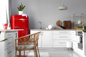 Wnętrze nowoczesnej kuchni ze stylową czerwoną lodówką