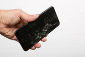 Ręka prezentuje smartfon z pękniętym wyświetlaczem