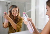 Piękna kobieta nakładająca suchy szampon na włosy. Szybki i łatwy sposób, aby utrzymać włosy czyste z suchym szamponem.