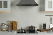 Blat z różnymi naczyniami do gotowania w kuchni