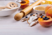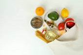 Składniki sosu pestowego - bazylia, oliwa z oliwek, orzechy sosnowe, parmezan i czosnek - na białym stole. Widok góry. Układy płaskie.