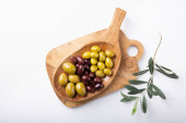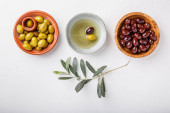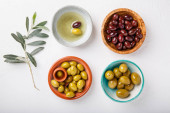 Różne rodzaje oliwek zielony i czarny w miski na białym stole. Widok z góry, zbliżenie, przestrzeń kopiowania.