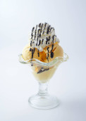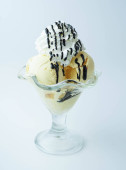 Kubek z trzema kulkami lodów bananowych, śmietankowych i truskawkowych