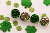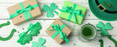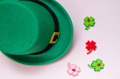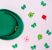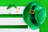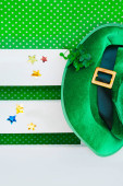 Top kapelusz, monety czekoladowe i kieliszki do liści koniczyny na białym stole