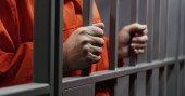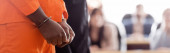 przycięty widok oskarżonego w kajdankach i pomarańczowym mundurze więziennym w sądzie