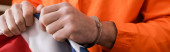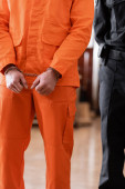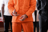 częściowy widok człowieka w kajdankach w więziennym mundurze na sali sądowej