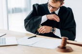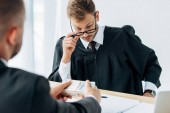 przemyślany sędzia trzymający okulary w pobliżu adwokata na niewyraźnym pierwszym planie