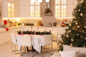 Przytulne wnętrze jadalni z choinką i piękny świąteczny wystrój