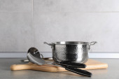 Zestaw różnych przyborów kuchennych na szarym blat w kuchni