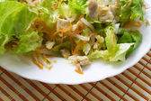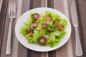 Widok z góry plasterki grillowanej wieprzowiny, gotowane jajka i majonez żywności i warzyw na potrawy. Brązowe tło. Koncepcja: Zdrowe menu do kontroli masy ciała. Jedzcie zdrowo..